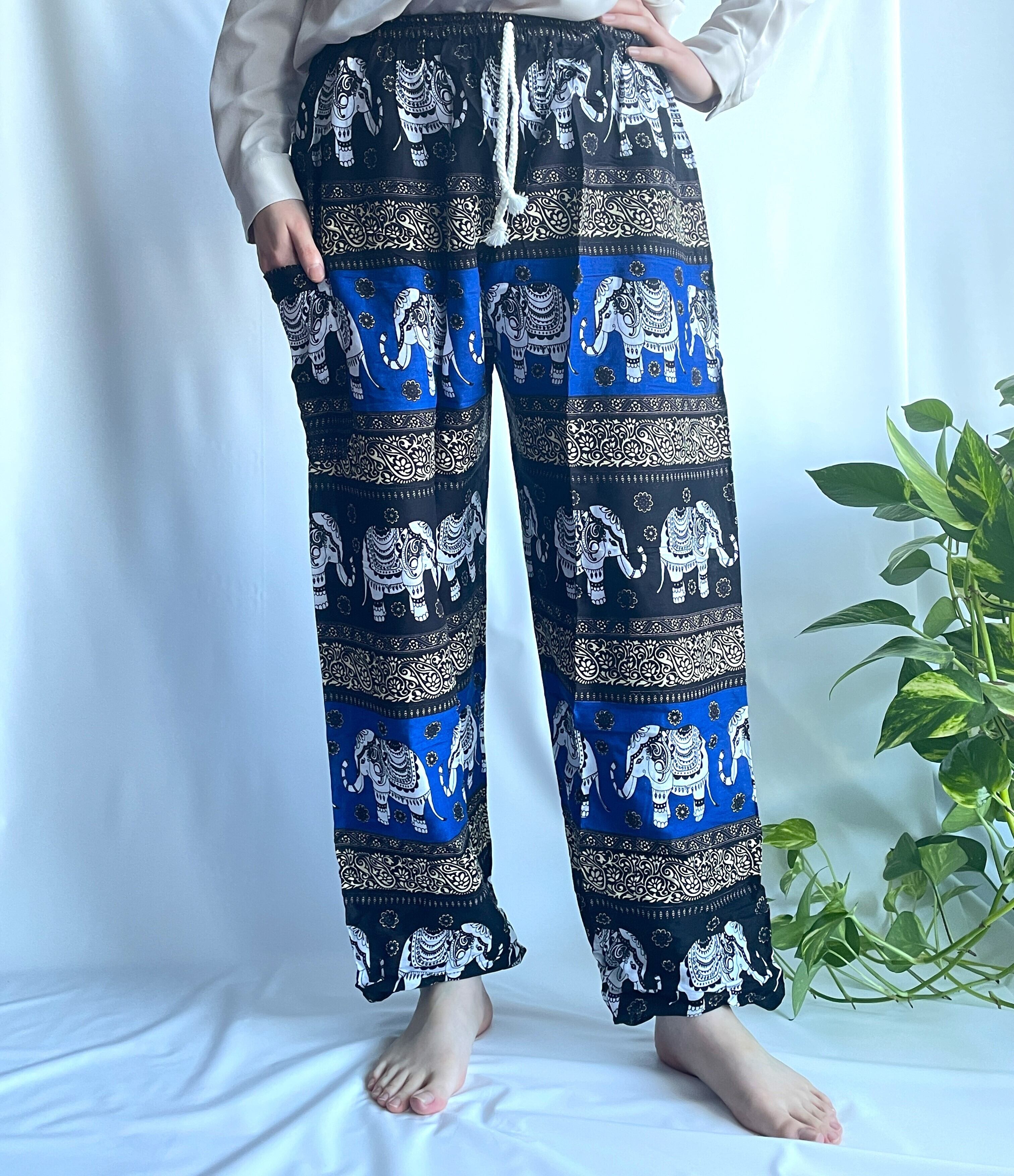 涼やかなブルーカラーの象柄が特徴的な、レーヨン100%のハーレムパンツです。